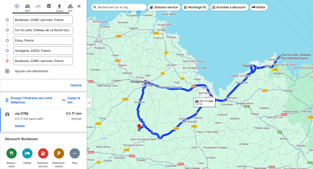 Return Journey: Approximately 100 km (~2 hours) via Erquy → Lamballe → Burlaouen